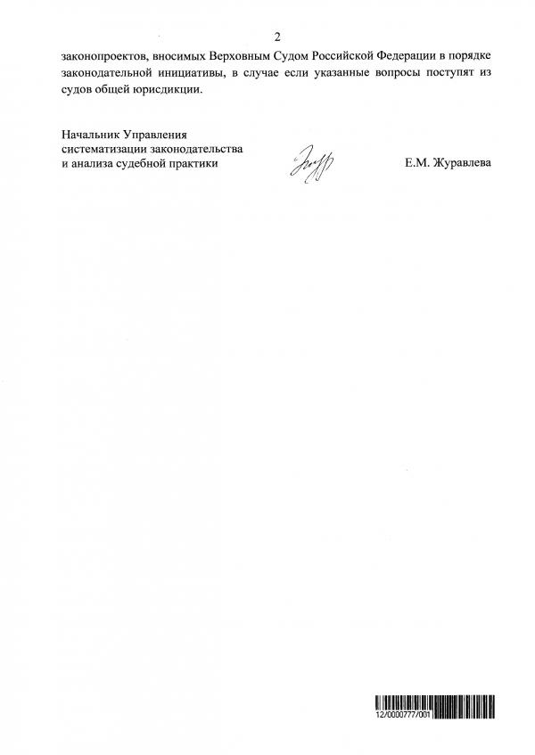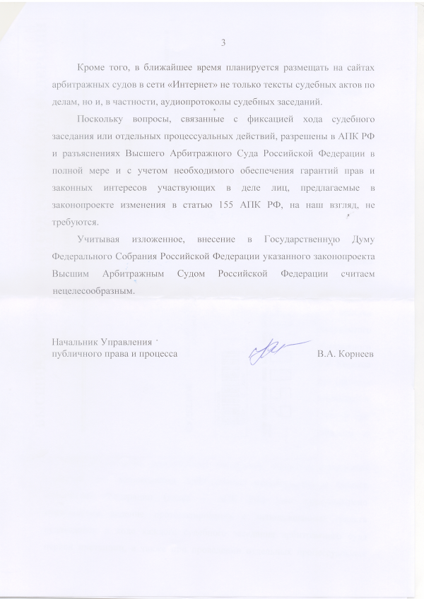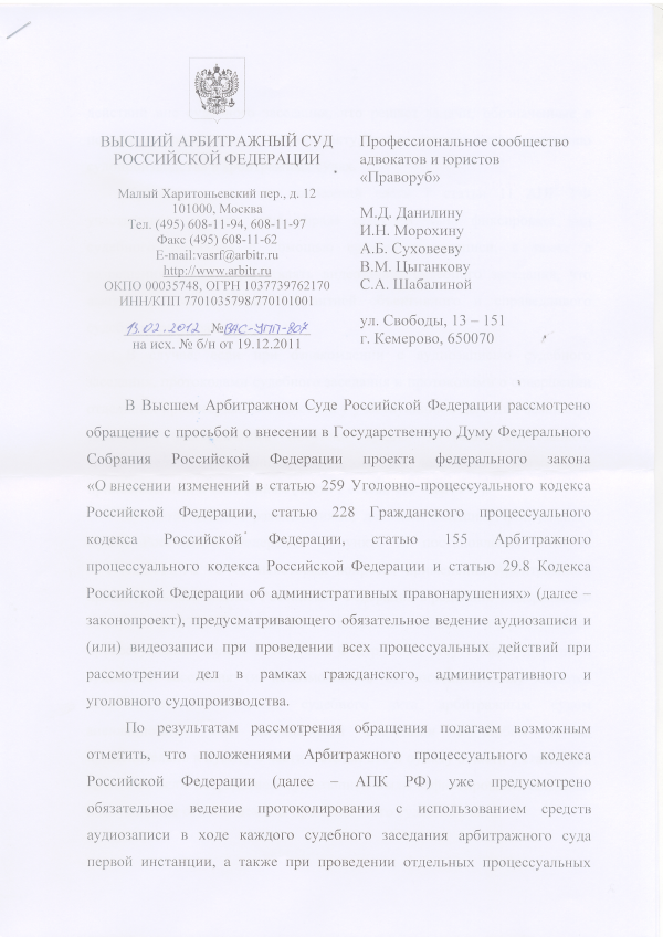 Поступил ответ Высшего Арбитражного суда РФ на обращение с просьбой внести в Государственную Думу проект федерального закона «О внесении изменений в ст. 259 УПК РФ, ст. 228 ГПК РФ, ст. 155 АПК РФ, и ст. 29.8 КОАП РФ»: