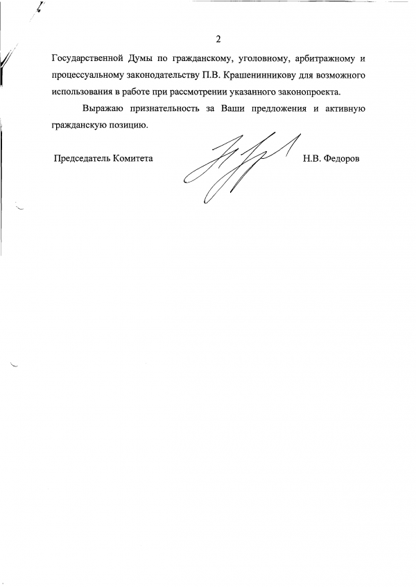 Государственной Думы по гражданскому, уголовному, арбитражному и процессуальному законодательству П.В. Крашенинникову для возможного использования в работе при рассмотрении указанного законопроекта.
