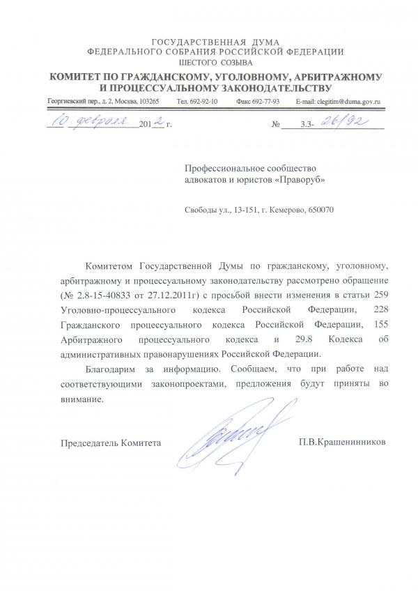 Поступил ответ Комитета Государственной Думы по гражданскому, уголовному, арбитражному и процессуальному законодательству на обращение с просьбой внести в Государственную Думу проект федерального закона «О внесении изменений в ст. 259 УПК РФ, ст. 228 ГПК РФ, ст. 155 АПК РФ, и ст. 29.8 КОАП РФ»: