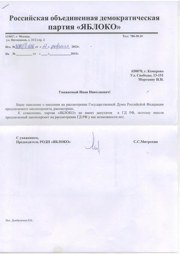 Лёд тронулся… Морохин супернереальный трудяга, это он практически один всё перелопатил, я думаю. если не пойдет в таком виде будем думать, что дальше. Коллеги отпишитесь, как что получит какие ответы. Нужно наверное было на группы разбиться. Господа, пишите везде и распечатывайте за друзей, коллег, знакомых МАМ, ПАП, братьев, сестер и отовсюду… в конце февраля должны появиться ответы (blush)… Потратим час, а выиграем целые лЕта и не только себе…