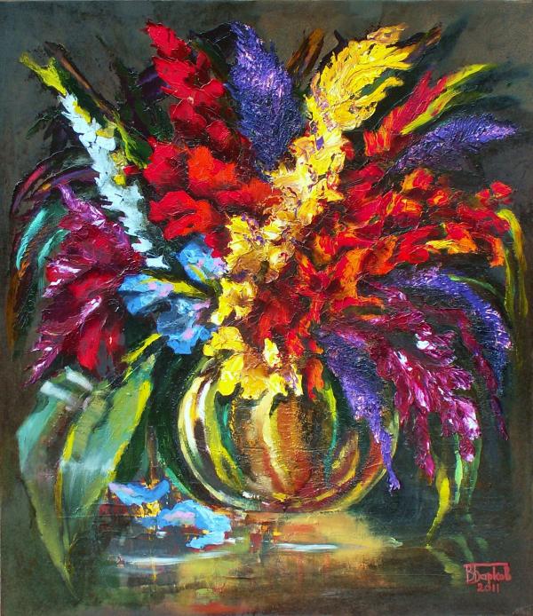 Знаю, что женщинам юристам — особенно непросто, желаю вам любви и «капать на мозги» мужчинам, как можно мягче, ведь капли, падая на голову, могут и с ума сводить, а могут — приятно холодить и радовать прикосновением. Будте кошечками в семье и тигрицами в суде. А это Вам цветы, мой друг Барков Володя написал, пальцем.