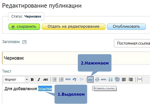 3. После чего, в режиме «редактирования» публикации надо выделить тот фрагмент текста, который будет вести на ссылку, и нажать на значок «Вставить ссылку».