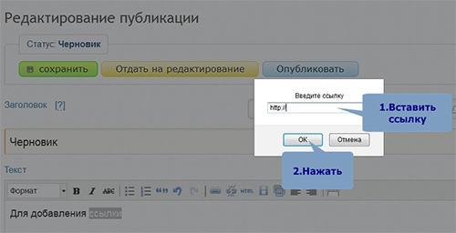 4. Далее, в появившемся окне необходимо вставить ранее скопированную ссылку (см. п.2) и нажать на кнопку «ОК».