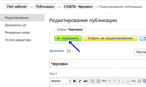 Откройте для редактирования сохраненный черновик публикации, для чего необходимо нажать на кнопку «Редактировать». Внимание: Кнопка «Редактировать» появляется при наведении на нее курсора: