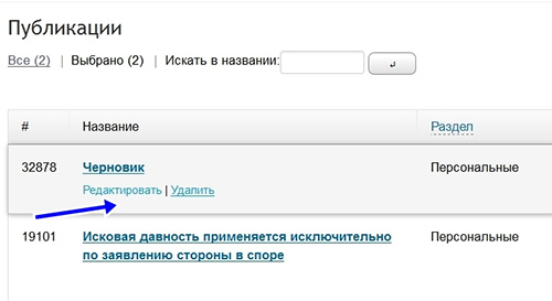2. Откройте для редактирования сохраненный черновик публикации, для чего необходимо нажать на кнопку «Редактировать». Внимание: Кнопка «Редактировать» появляется при наведении на нее курсора: