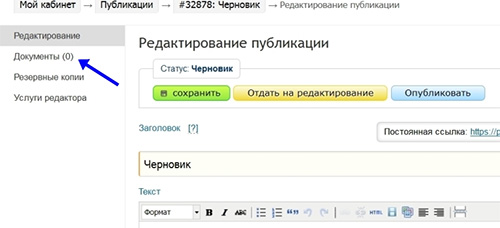 В личном кабинете откройте раздел «Публикации»: