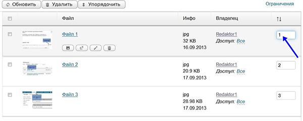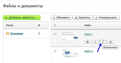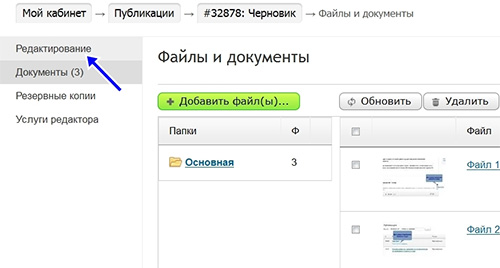 4. После того как выбранные вами файлы появятся в окне «Документы», надо их переименовать и упорядочить. Чтобы переименовать, нажмите на соответствующую кнопку и введите название понятное для тех, кто будет читать вашу статью. Внимание: кнопка «Переименовать» появляется при наведении на нее курсора.