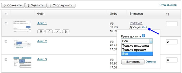 7. Кроме того вы можете ограничить доступ к файлам, для этого здесь же в столбце «Доступ» нажмите на «Все» напротив вашего документа, выберите уровень доступности документа и нажмите «Изменить».