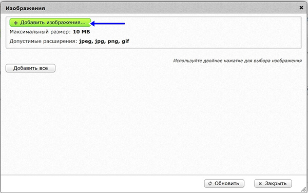 2. Далее, в открывшемся окне надо нажать на кнопку «Добавить изображения»