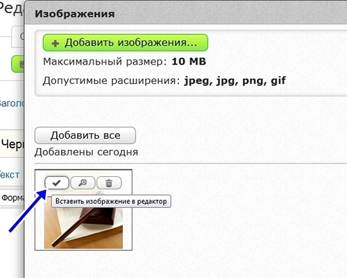 4. После чего, картинка появится в окошке «Изображения», где нужно нажать на кнопку с галочкой – «Вставить изображение в редактор». Внимание: данная кнопка появляется при наведении на нее курсора.