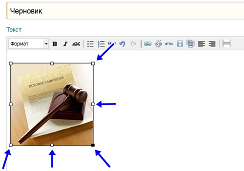 6. Чтобы изменить размер картинки, необходимо кликнуть на нее мышью – появится «граница» картинки, далее необходимо "взяться" за любой из углов картинки и потянуть за любой из краев: