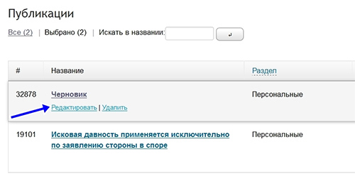 Откройте для редактирования сохраненный черновик публикации, для чего необходимо нажать на кнопку «Редактировать». Внимание: Кнопка «Редактировать» появляется при наведении на нее курсора: