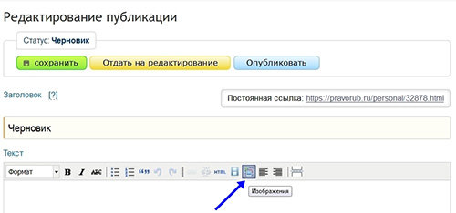 1. В режиме редактирования публикации надо нажать на кнопку «Изображения»: