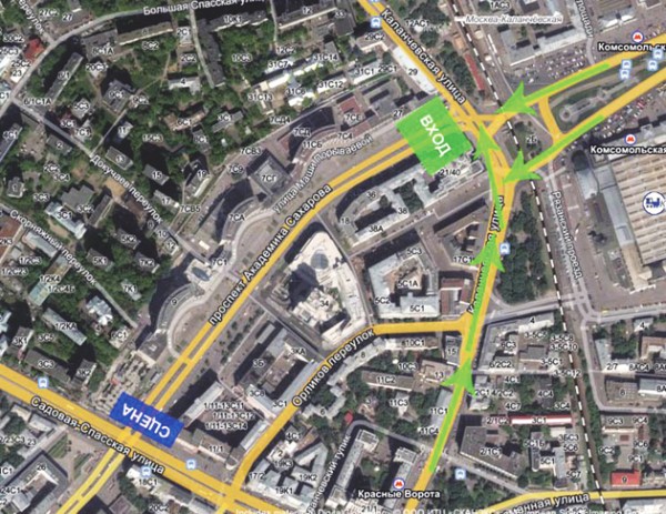 Ближайшие станции метро – «Комсомольская» и «Красные ворота» будут работать в обычном режиме. Самый удобный маршрут — м. «Комсомольская», выход в сторону Ленинградского вокзала. По этому маршруту будет образована пешеходная зона. (Будет, по всей видимости, оцепление. Там, где пешеходная зона пересекает проезжую часть, выставят грузовики.)