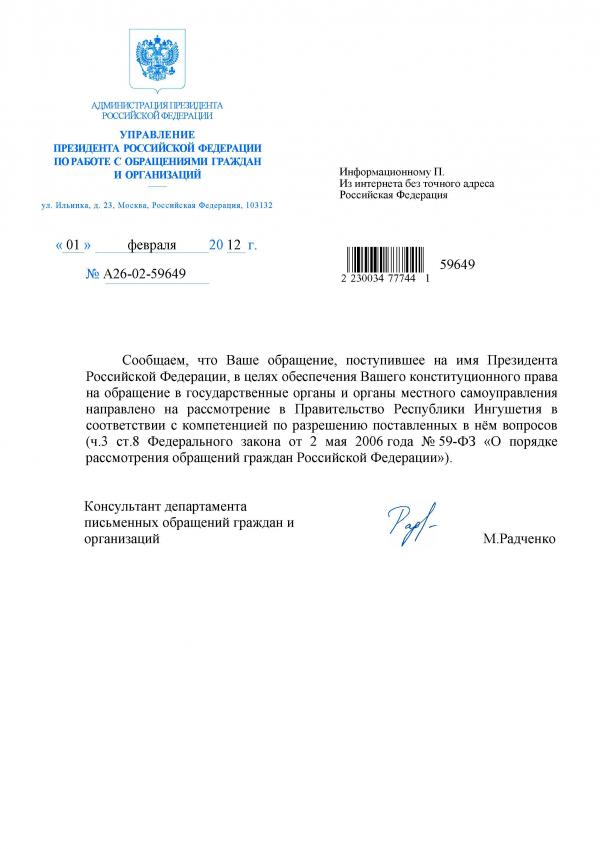 На Вашу жалобу поступил ответ Управления Президента РФ по работе с обращениями граждан и организаций следущего содержания: