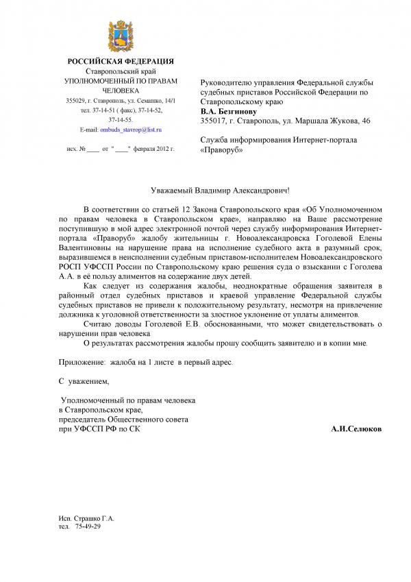 На данную жалобу поступил ответ Уполномоченного по правам человека в Ставропольском крае, председателя Общественного совета при УФССП РФ по СК, следующего содержания: