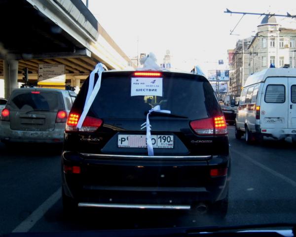 Оказалось, это автомобиль Бориса Акунина:). Мы почти все время ехали за ним. Вот его фоторепортаж. Оценка Акуниным количества участников акции совпадает с моей: Длина Садового – километров пятнадцать. Всюду, где я был, «белогвардейцы» ехали в два, а то и в три ряда. Сколько это получается? Тысячи три как минимум.