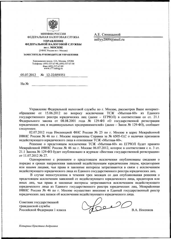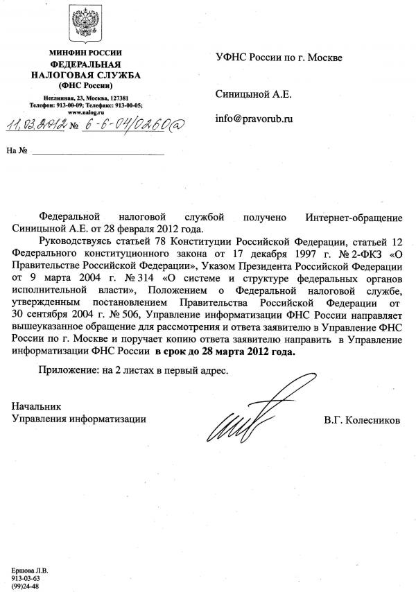 На данное письмо поступил ответ УФНС РФ по г. Москве, следующего содержания: