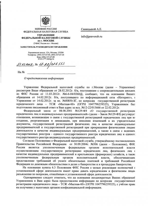 Вступившим в законную силу решением Симоновского районного суда г. Москвы от 01.12.2010 г. доказано, что протокол № 1 общего собрания и само общее собрание признаны недействительными. ИФНС № 46 принято решение № 26828 от 06.07.2012 г. о предстоящем исключении ТСЖ Мытная-60 из Единого государственного реестра юридических лиц — эта официальная информация опубликована в «Вестнике гос.регистрации юридических лиц» в части 2 номер журнала 27(385) за июль 2012 года и доступна для ознакомления всех желающих.