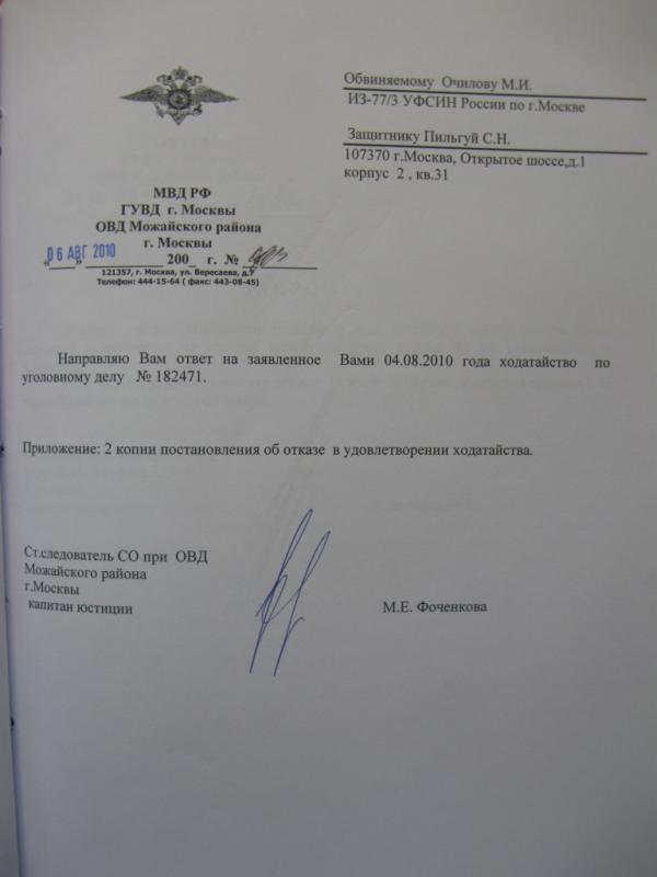 Извольте, Алексей Анатольевич, «угоститься номером» из ответа следователя М. Е. Фоченковой из ОВД «Можайский». Комментарии будут излишними, как и такие «номера» в ответах, а так же писавший их сотрудник в органах следствия. Была бы моя воля, то я до конца службы сделал бы ей зарплату с такими первыми «цифрами» и тем количеством нулей, которая она пожелает. Поэтому, я уже давно не верю их «номерам» и даже не пытаюсь их узнать или понять, т.к. их просто нет.