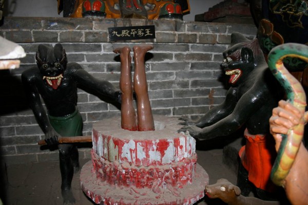 Дунган провинции Ляонин. А там, на горе недалеко от города находится старинный буддистский монастырь. Сколько я их посетил по всему Китаю, а такого примечательного не видел нигде. В нем, в одном из боковых павильонов был показан совершенно замечательный кусочек Буддистской Преисподней. Миниатюрные, сантиметров в 40-50 скульптуры показывали как буддистские черти варят буддистских грешников в чанах с маслом, как они колесуют их, выкалывают спицами глаза, вытягивают из брюха кишки, нарезают ремнями кожу со спины… Помнится даже тогда, за 19 дней до посадки в СИЗО, я понял что именно в такие «благословенные» места попадают российские судьи, которые сплошь и рядом выносят заведомо неправосудные приговоры.