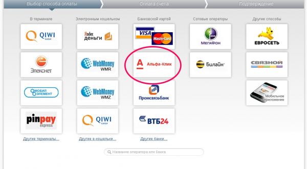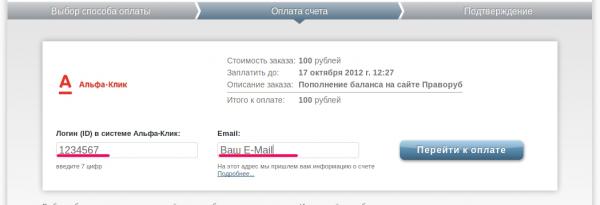 Рассмотрим пример пополнения счета через Альфа-Клик.