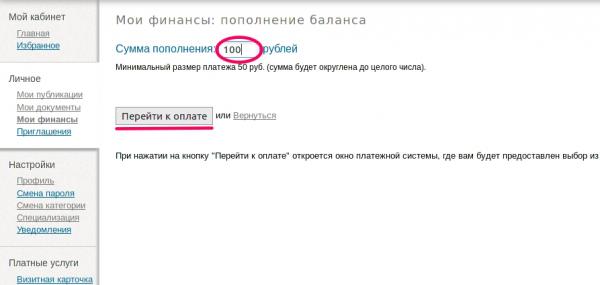 На следующей странице «Мои финансы: пополнение баланса» потребуется ввести желаемую сумму пополнения и нажать кнопку «Перейти к оплате». Здесь следует учитывать, что минимальная сумма для ввода на сайт — 50 рублей (таковы ограничения системы).