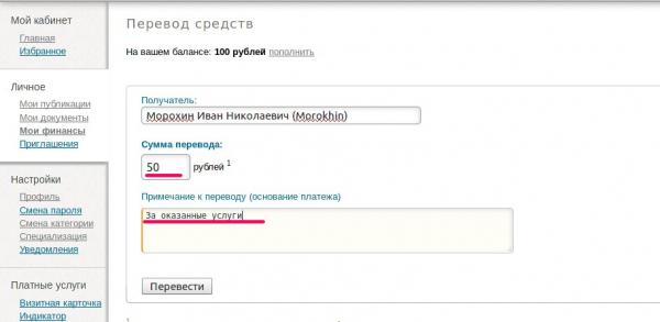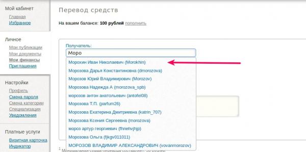 На странице «Перевод средств» в поле получатель достаточно начать набирать фамилию, имя или логин пользователя, чтобы появился список совпадений.