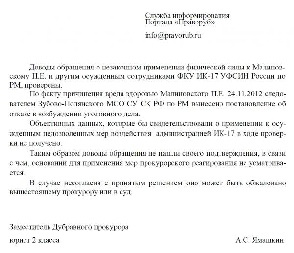 Вот такие вот ответы-отписки приходят осужденным постоянно, без исходящих номеров, числа и без фамилии следователя Зубово-Полянского МСО СУ СК РФ по РМ вынесшего постановление об отказе в возбуждении уголовного дела и других должностных лиц кто давал показания. Подписи Заместителя Дубравного прокурора юриста 2 класса А.С.Ямашкина так же нет.Все засекречено? Вопрос к администрации портала обжаловать данное решение можно прямо тут или для этого можно написать отдельную статью так как в разделе жалобы на чиновников нельзя добавить документы?