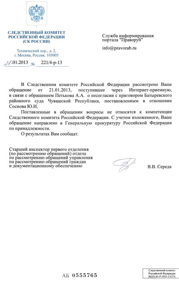 На данную жалобу поступил ответ из Следственного комитета Российской Федерации: