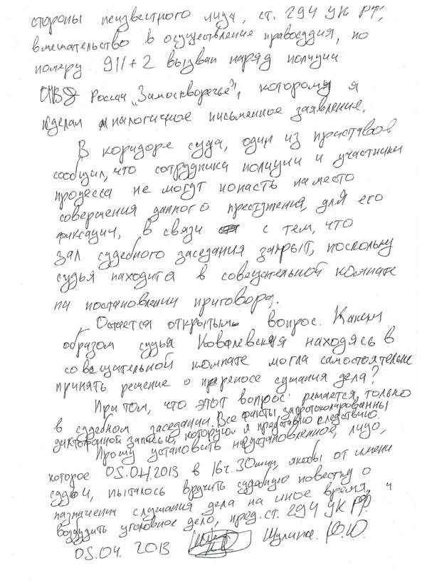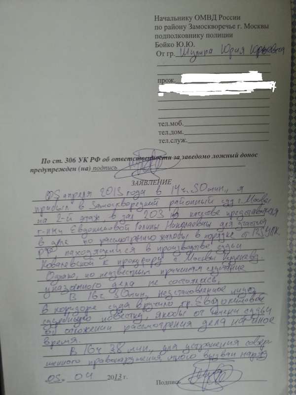 Полицейские и приставы По факту незаконного вмешательства неустановленным лицом в осуществление правосудия, мною через наряд полиции на имя начальника ОМВД России Замоскворецкого района Москвы подано заявление о преступлении в порядке ст. 141 УПК.
