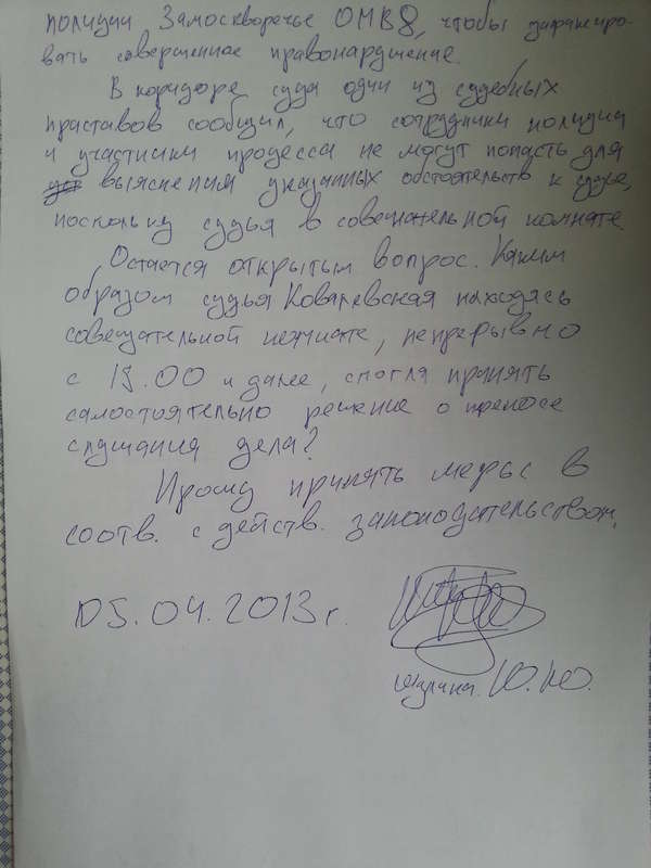 Жалоба подана в суд (Замоскворецкий районный суд г.Москвы), а не судье Ковалевской. То есть, — воспрепятствование осуществлению правосудия создано самим судом. Какое участие в этом приняла судья Ковалевская,- это установит (по крайней мере,- должен установить) орган следствия. Однако, по «ходу пьесы» усматривается, что проблема здесь не только и не столько в судье Ковалевской, а в организации правосудия в Замоскворецком районном суде г.Москвы, системе правосудия г.Москвы, Российской Федерации в целом.