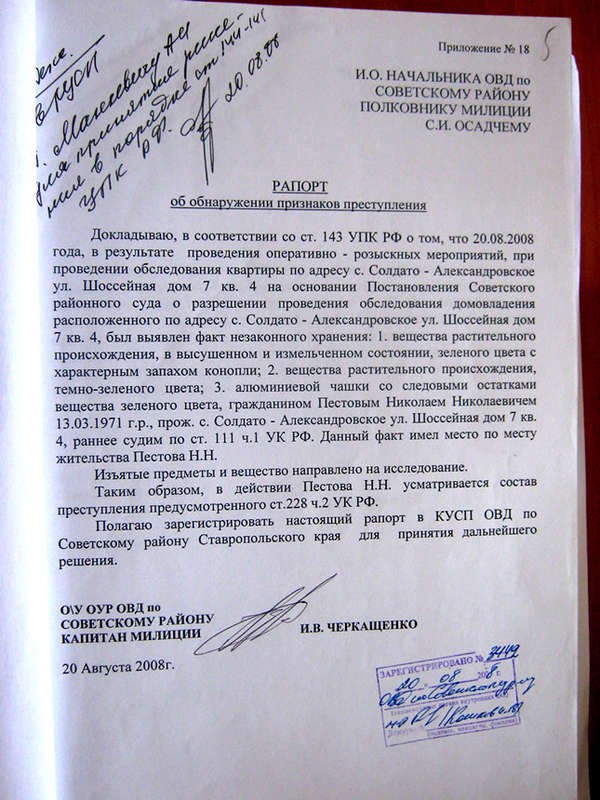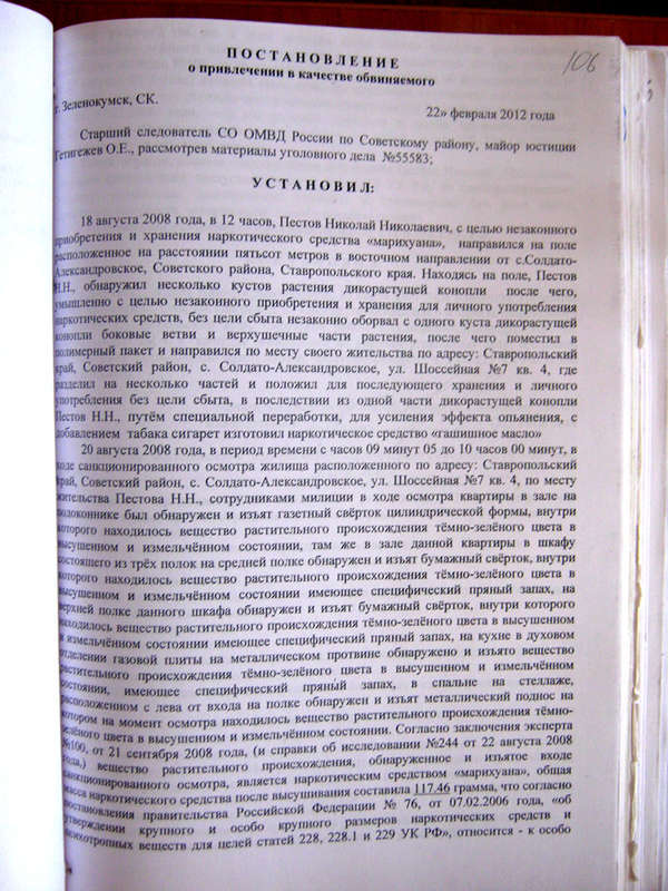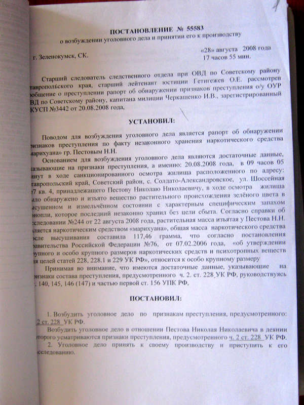 Но из материалов дела следует, что 20 августа 2008 г. оперуполномоченным Черкащенко, на основании разрешения судьи Лазько А.А. Советского районного суда Ставропольского края от 19 августа 2008 г., выданного на основании ст. 6-9 Федерального закона, было проведено с участием понятых и с составлением процессуальных документов по его результатам, обследование жилого помещения Пестова, в результате которого обнаружено и изъято 117,46 г конопли и «гашишное масло» 2.21гр. Какого-либо согласия на проникновение в жилище от Пестова Н. Н. получено не было.