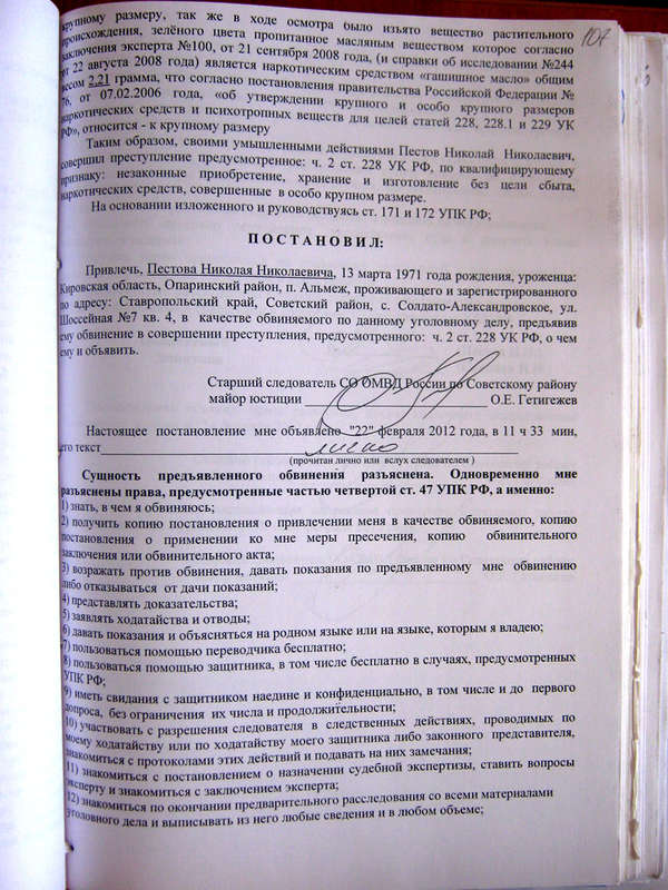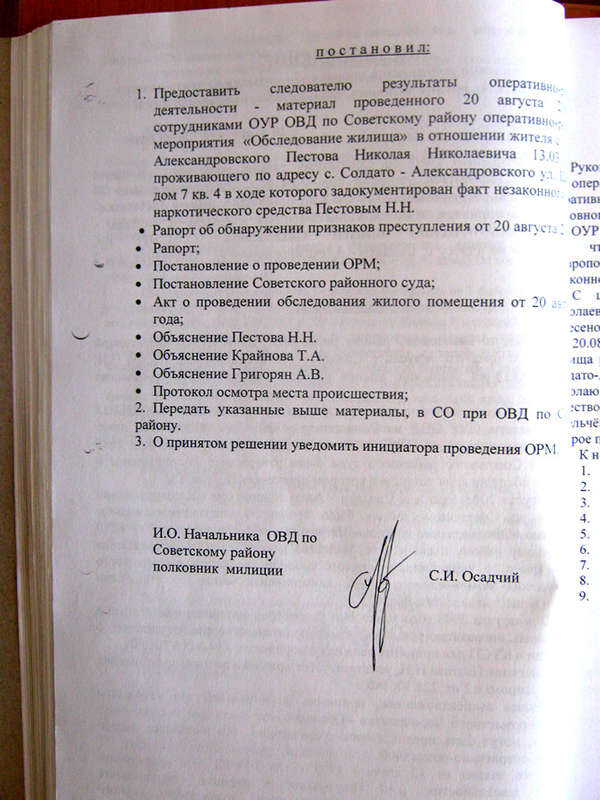 3. На основании этого документа этот же оперуполномоченный участвует в проведении данного «санкционированного» ОРМ. Само проведение ОРМ зафиксированно соответствующим «актом о проведении обследования жилого помещения» из которого видно, что «обследование домовладения» было проведено с участием понятых и с составлением процессуальных документов в ходе которого и по его результатам обнаружено и изъято определенное кол-во вещества, которое и явилось поводом для возбуждения УД. И именно на основании доказательств, полученных в ходе это санкционированного ОРМ суд вынес Пестову обвинительный приговор.