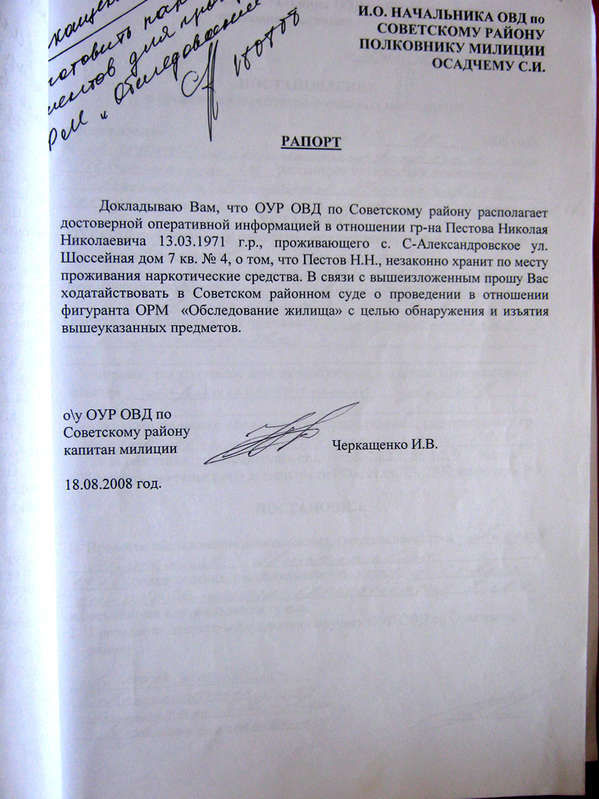 1. На основании оперативного рапорта в котором говориться о том, что есть достоверная оперативная информация о том, что Пестов Н.Н. хранит у себя дома наркотические средства, с согласия руководства оперуполномоченный пишет ходатайство для суда с просьбой разрешить ОРМ «обследование домовладения» с целью обнаружения и изъятия данных запрещенных веществ.