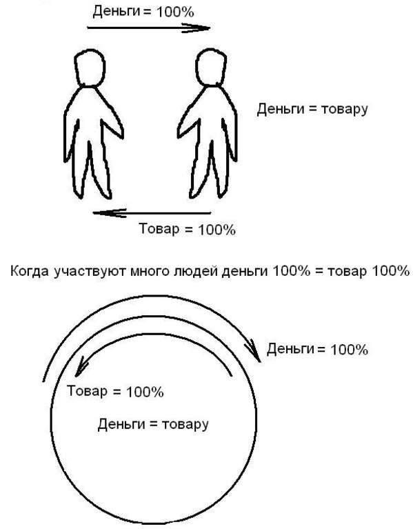 Ничего сложного, в упрощенной схеме, двигателя внутреннего сгорания – это понятно даже ученику 5 класса. Рассмотрим нашу экономику, как «двигатель» прогресса. Все знают, что очень давно, люди меняли товар на товар, то есть получаем 1=1. Потом придумали деньги, и деньги стали мерой товара. Чтобы был честный обмен, деньги привязали к определенному количеству золота. Упрощенно обмен можно представить в виде картинки.