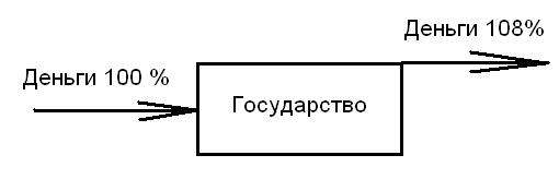 Это значит, что в нашем государстве такая схема вращения денег и товаров должна работать. Замкнутый круг деньги в одну сторону, а товар в другую сторону. Отсюда видно, что КПД такой экономики = 1 или 100 %. Об этом хорошо рассказал генерал Петров. Но у нас в государстве совсем другая экономика. У нас есть государство, которое берет у Центрального Банка (ЦБ РФ) кредит, Но ЦБ РФ не принадлежит нашему государству, а является частной компанией США. Рассмотрим, как это работает во времени.