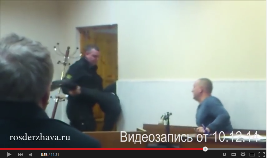 Уважаемый Вадим Валерьевич, ролик достоверный. Это судебное заседание Чудовского районного суда в г. Малая Вишера Новгородской области от 10 декабря 2014 года. Чем закончилось противостояние, никому неизвестно. Уголовное дело рассмотрено на прошлой неделе, но уже без адвоката Вяткина. В бронежилете он был потому, что 04 декабря 2014 года его уже вытаскивали из зала все по той же причине, конечно, он несколько эпатажен, но судья неправ.