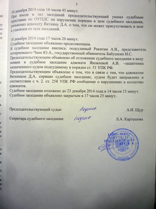 Справедливые попытки адвоката Вяткина призвать суд к соблюдению регламента не только не привели к результату, но и навлекли на защитника настоящий гнев, со стороны председательствующего.