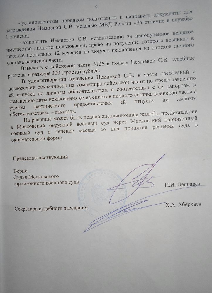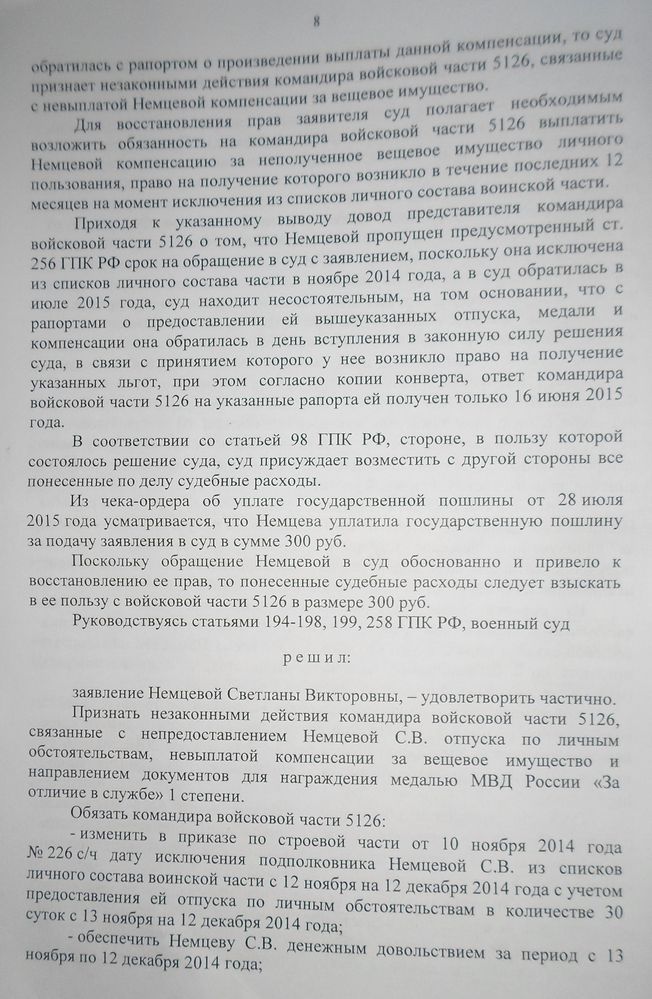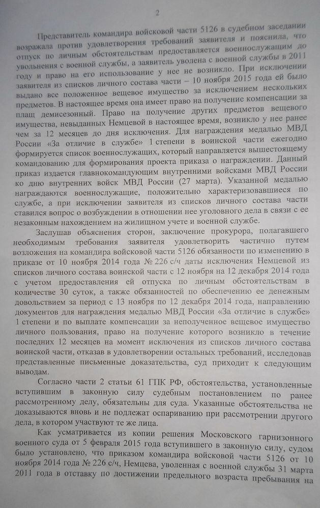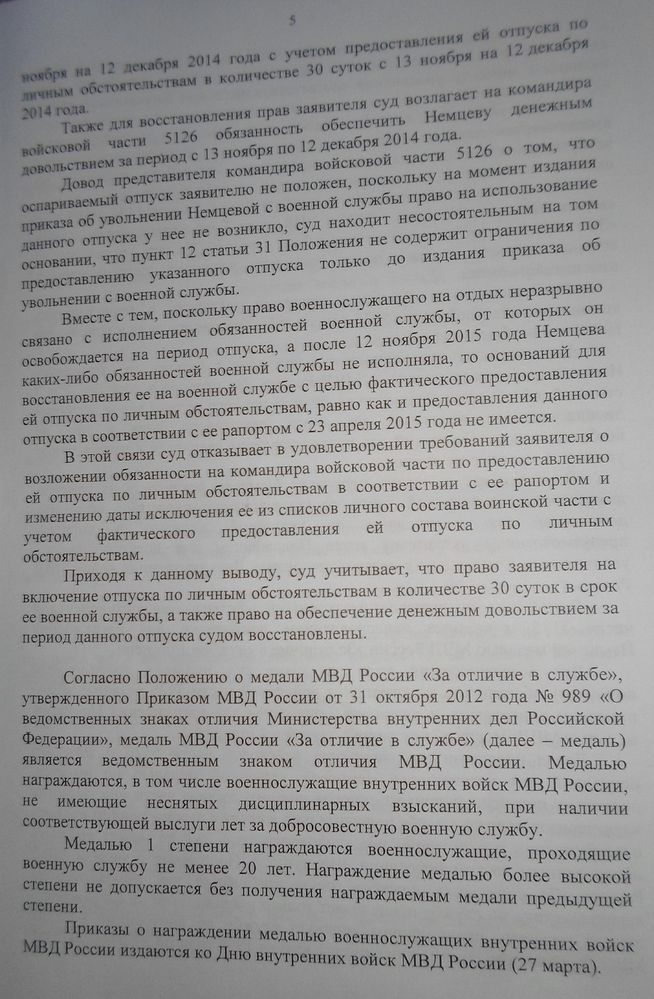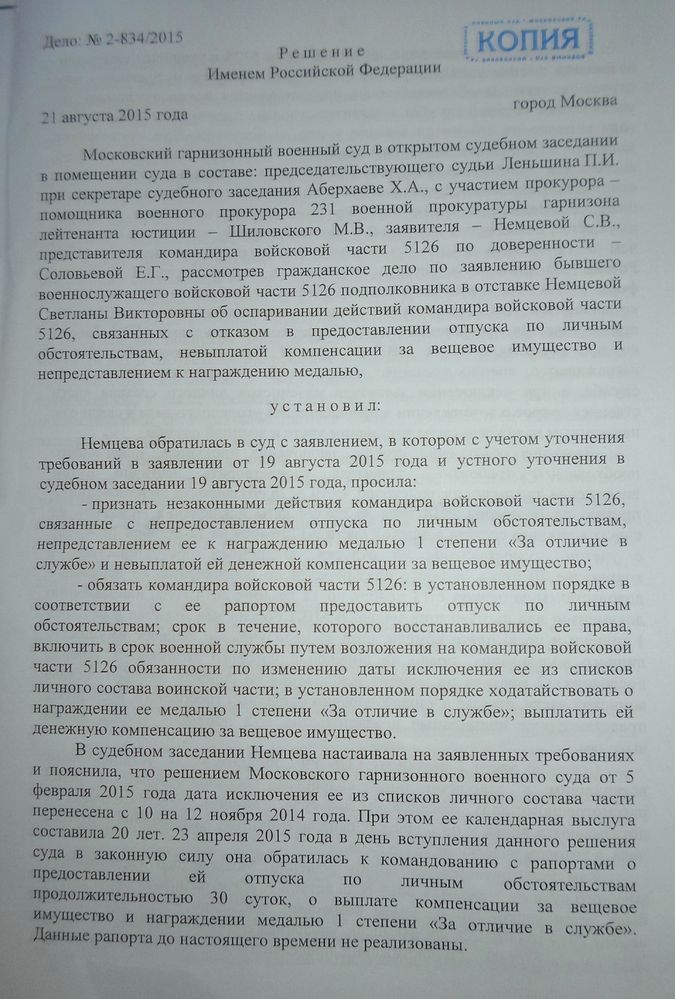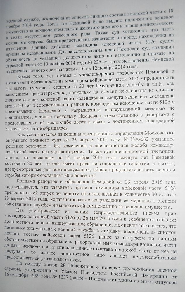 Уважаемый Владимир Михайлович, даю краткую выжимку из апелляции 1. Из исследованных в суде документов усматривается, что я просила предоставить отпуск по личным обстоятельствам сроком 30 суток после вступления в законную силу решения суда. Мне в соответствии с данным решением отпуск по личным обстоятельствам предоставлен задним числом Я не выражала желания о предоставлении мне отпуска по личным обстоятельствам 12 ноября 2014 года, так как была незаконно исключена из списков личного состава части 10 ноября 2015 года. В силу пункта 10 статьи 11 Федерального закона «О статусе военнослужащих» военнослужащим, общая продолжительность военной службы которых составляет 20 лет и более, в один год из трех лет до достижения ими предельного возраста пребывания на военной службе либо в год увольнения с военной службы по состоянию здоровья или в связи с организационно-штатными мероприятиями кроме основного отпуска по их желанию предоставляется отпуск по личным обстоятельствам продолжительностью 30 суток. Данная норма продублирована и в пункте 12 статьи 31 Положения о порядке прохождения военной службы. Таким образом, одним из обязательных условий для предоставления такого отпуска федеральный законодатель предусмотрел желание самого военнослужащего, однако как установлено в суде я такого желания 12 ноября 2014 года не высказывала (была уже лишена статуса военнослужащего), в связи с тем, что было желание восстановить свои законные права связанные с незаконным исключением из списков личного состава части и решением Московского гарнизонного военного суда от 05 февраля 2015 года вступившего в законную силу установленно, что действия командира войсковой части 5126 были не правомерны.