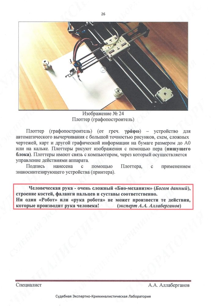 Чем принципиально отличается поддельная подпись, выполненная плоттером, от поддельной подписи, выполненной человеком? Качеством, точностью исполнения? Ну, тогда пожалуй, наверное, плоттер может помочь криворуким мошенникам или превратить изготовление поддельных документов из элитного производства в массовое. В смысле, что любой начинающий авантюрист сможет выполнить чужую подпись так, чтобы не получить изображение, не похожее на оригинал, как это часто бывает с теми, кто берётся за подделку впервые или занимается этим редко. Большого значения плоттеру в делах поддельных я не придаю, так как тот же самый результат доступен любому, кто набил руку в рисовании чужой подписи. Любую поддельную подпись, выполненную что человеком, что плоттером, можно выявить на основании проверенных методик в сравнении с оригиналом (т.е. со свободными, условно-свободными и экспериментальными образцами оригинальной подписи). Конечно, после того, как выявится подделка подписи, хочется выяснить и автора подделки — вот здесь плоттер, конечно, не заменимый помощник, поскольку «вкалывают роботы, а не человек» ©. Но, повторяю, никакой плоттер не может добиться степени близости к оригинальной подписи большей, нежели это смог бы сделать достаточно искушённый в подделке подписей человек. В обоих случаях подпись будет похожа, и в обоих случаях существующие методики при хорошей работе эксперта сможет выявить подделку. В конце концов, даже плоттер, имитирующий руку, не способен сделать ничего большего, чем настоящая не оригинальная рука. Повторить все изгибы в точности как это делает владелец подписи, не способен даже плоттер, поскольку даже у него есть «почерк».