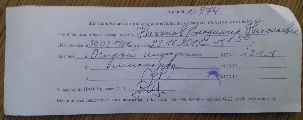 Прощание состоится завтра, 25.12.2017, с 12.00 до 14.00, по адресу: г.Белебей, ул.Мало-Луговая, д.64а.