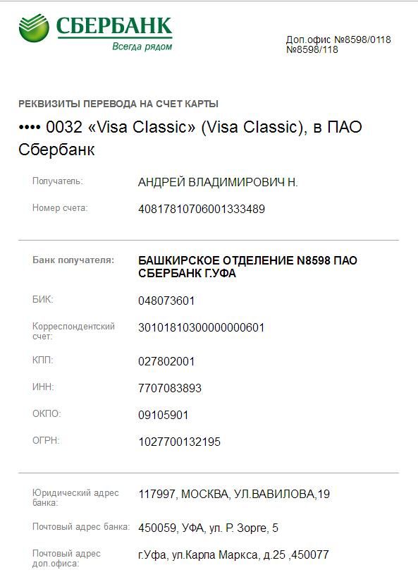 № счёта (не карты) 40817810706001333489 в БАШКИРСКОМ ОТДЕЛЕНИИ N8598 ПАО СБЕРБАНК г.УФА, БИК: 048073601