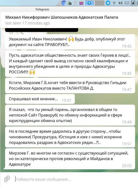Уважаемый Андрей Юрьевич, вчера я сомневался в авторстве комментариев от имени «Шапошникова Михаила», но вечером, с телефона Михаила Никифоровича Шапошникова (полагаю, что телефон подделать сложнее, чем аккаунт) мне поступили просьбы разместить на Праворубе заявление Талантова Д.Н. генеральному прокурору о принятии конференцией АП УР резолюции по принятым изменениям в КПЭА, которое, как и сама резолюция, были уже неоднократно опубликованы сами Д.Н. Талантовым, а так же другие сообщения, к которым я просто уже и не знаю как относиться...