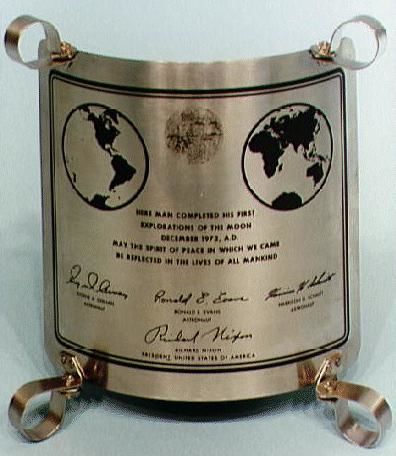 Возвратившись к лунному кораблю, астронавты сняли крышку с мемориальной пластины, установленной на одной из опор шасси. На пластине выгравирована надпись:«Здесь люди завершили первые исследования Луны в декабре 1972 года. Да, пребудет дух мира, который руководил нами, в жизни всего человечества». Под этими словами подписи: Ю. Сернана, Р. Эванса, X. Шмитта и президента США Р. Никсона.