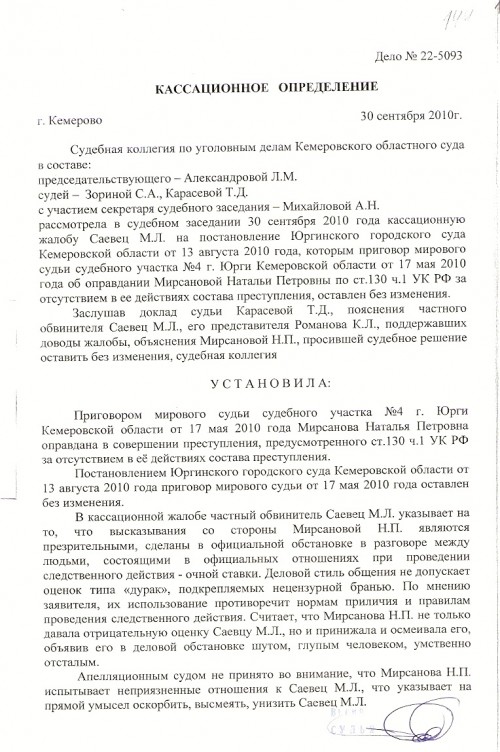 13 августа 2010 года Юргинским городским судом председательствующей Кильмухаметовой М.В. в апелляционном порядке вынесено постановление по уголовному делу №10-14/2010 местного обвинения по которому суд постановил приговор мирового судьи судебного участка №4 г.Юрги Кемеровской области от 17 мая 2010 г., в котором оправдана Мирсанова Наталья Петровна по ст. 130 ч. 1 УК РФ оставить без изменения, а апелляционную жалобу представителя частного обвинителя — без удовлетворения. С приговором Мирового суда от 17 мая 2010г. и постановлением Юргинского городского суда от 13 августа 2010г. я не согласен по следующим основаниям: