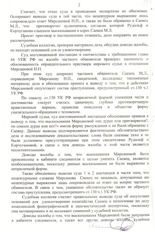 Апелляционным судом не принято во внимание, что Мирсанова Н.П. испытывает неприязненные отношения к Саевец М.Л., что указывает на прямой умысел оскорбить, высмеять, унизить Саевец М.Л. а именно протокол 3 августа 2010 года, Мирсановой суд задал вопрос: в связи с чем потерпевший может вас оговаривать?