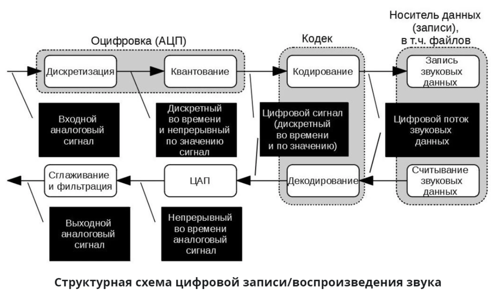 Для установления степени соответствия стандарта современному уровню развития цифровых технологий звукозаписи следует обратиться к структурной схеме цифровой записи/воспроизведения звука (см. рисунок) и типовым задачам фоноскопической экспертизы. И тогда станет ясно, что главными и критическими недостатками нового стандарта являются: отсутствие в необходимом объеме понятий, используемых в ключевых видах исследования — идентификации дикторов и диагностике аутентичности фонограмм, отсутствие логической связи или взаимообусловленности между некоторыми ключевыми понятиями. Например, из Примечания 2 к понятию 11 следует: